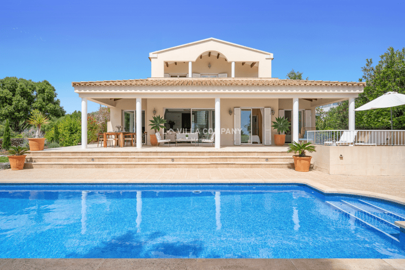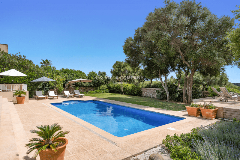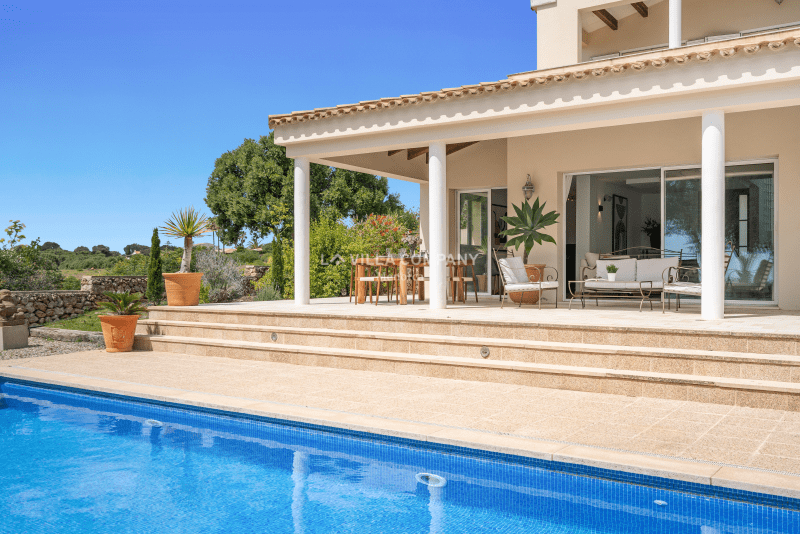 La casa está rodeada de campo abierto y el jardín cuenta con varias zonas para tomar el sol y relajarse a la sombra. Conectado al salón hay un porche cubierto, amueblado con sofás exteriores y una mesa con sillas para comer al aire libre. La piscina, con escalera romana, está rodeada de terraza y amueblada con tumbonas y una sombrilla. Detrás de la piscina hay una zona de césped y una terraza elevada para disfrutar de las vistas al campo.