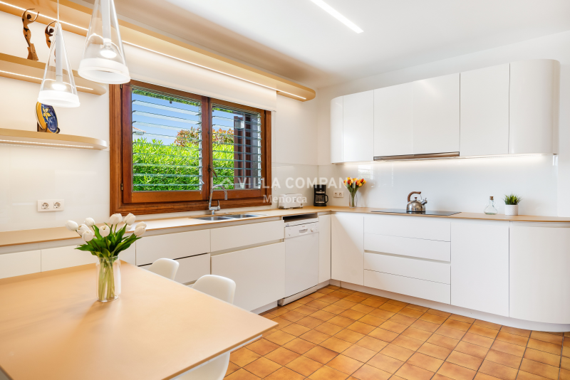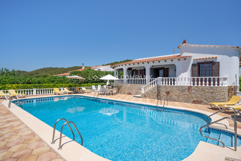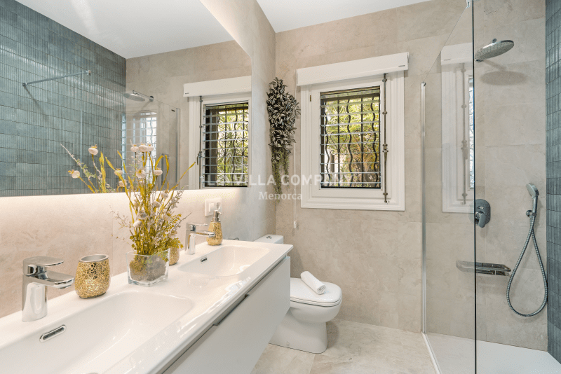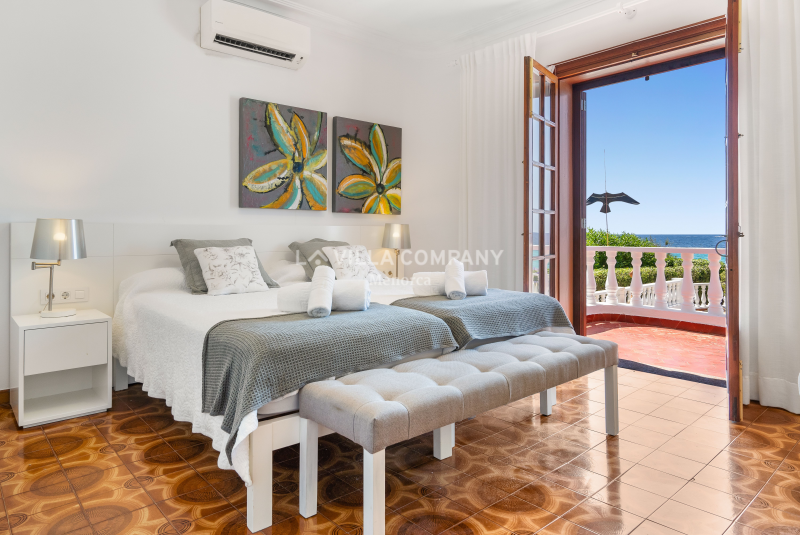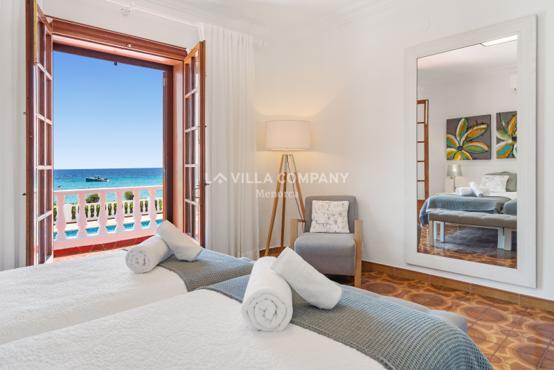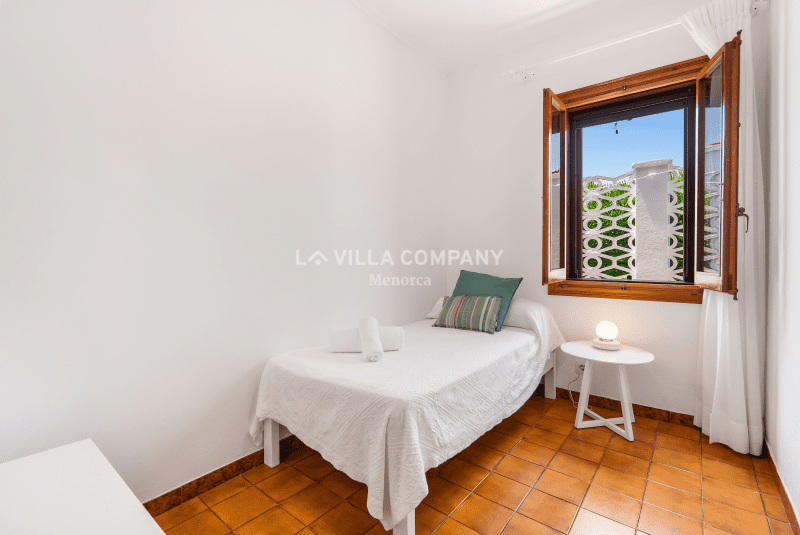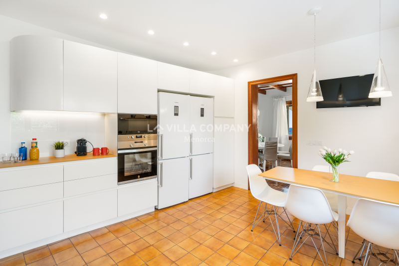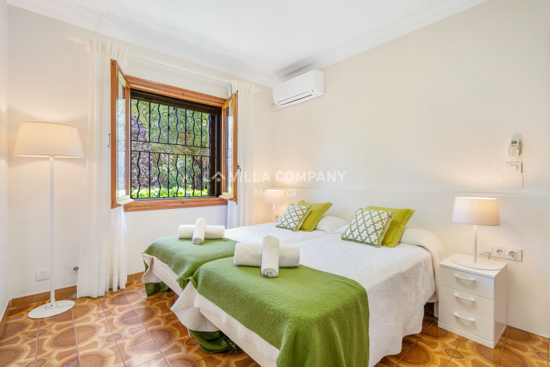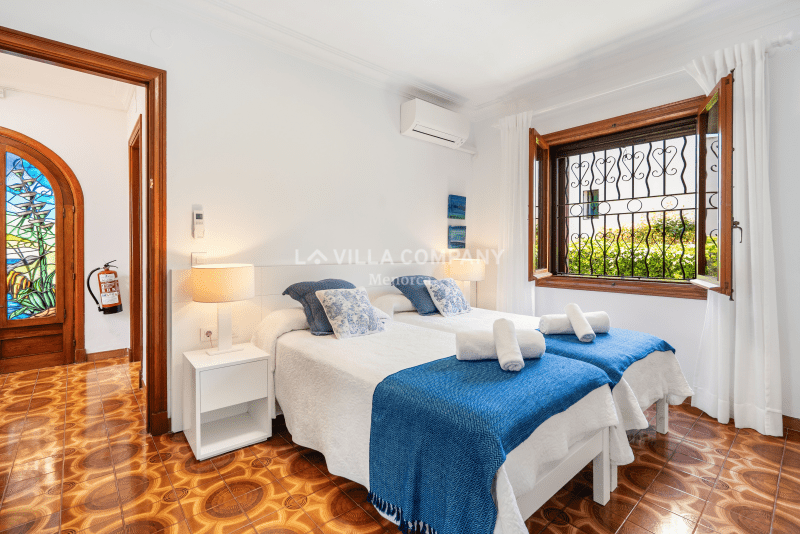 All rooms are distributed on ground level and comprise of a lounge/dining room with Smart TV and wifi, a large fully equipped kitchen, and five tastefully decorated bedrooms, catering to various sleeping arrangements. The master bedroom features a comfortable double bed, while three other bedrooms are furnished with twin beds, allowing flexibility for families or friends sharing. Additionally, there is a cozy single bedroom, ensuring everyone has their own private sanctuary. To keep guests comfortable in the warm Menorcan climate, the villa features air conditioning in the bedrooms during nocturnal hours.