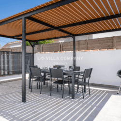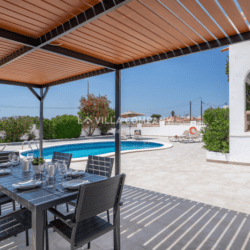 Connected to the lounge is a covered porch, furnished with table and chairs for al fresco dining and relaxing in the shade. The spacious pool terrace, which is accessed via steps, has sunbeds with a parasol for shade, and a large pergola with a second table with chairs and a barbeque.