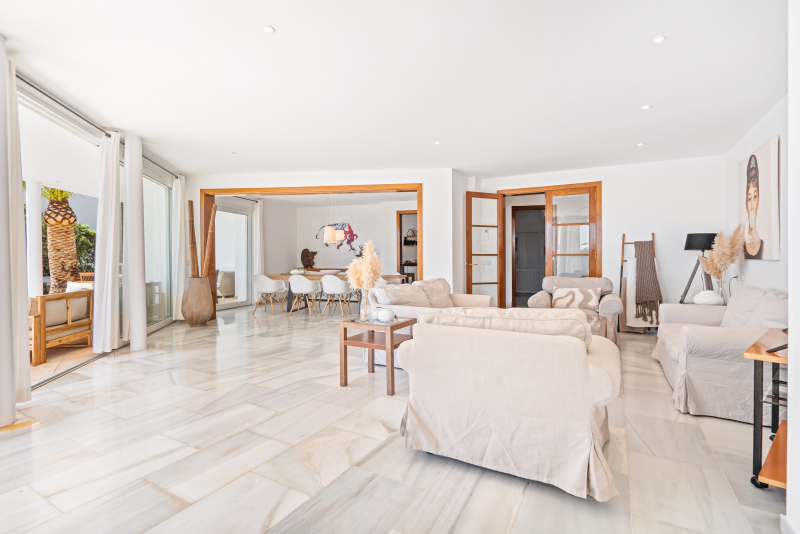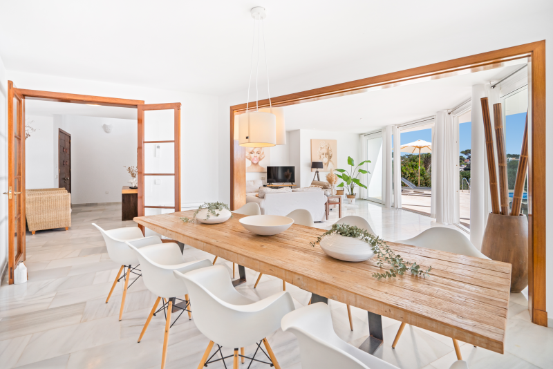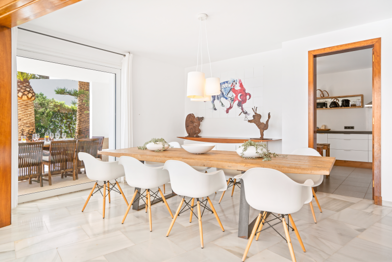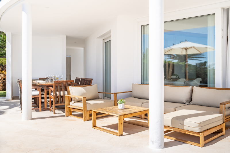 Villa Rocamar boasts spectacular sea views from the garden area, which has privileged access to the bathing platforms and the Mediterranean Sea directly in front of the property. Bordering the large swimming pool (15m x 6m) is a grass lawn and sunbathing terrace furnished with comfortable sun loungers. Connected to the house, a covered porch with a large wooden dining set is the ideal spot for al fresco dining and outdoor living.